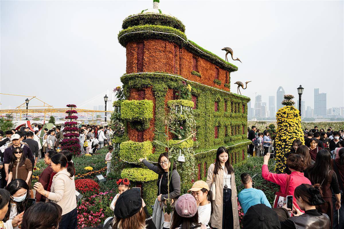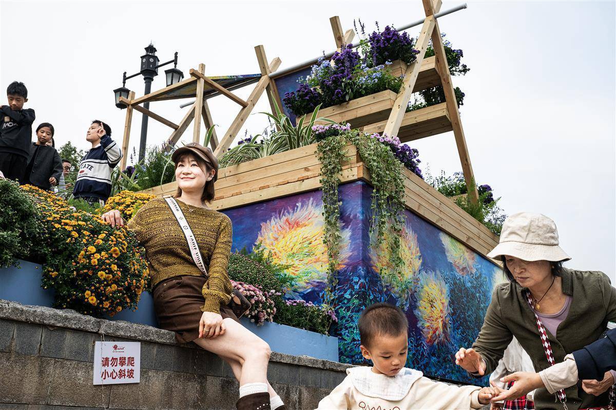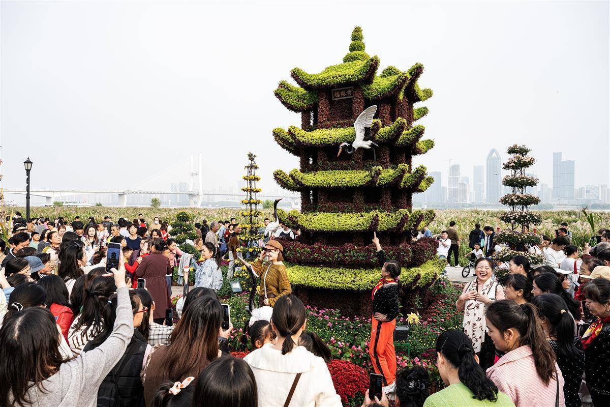 11月1日,在汉口江滩主展区,黄鹤楼、巴公房子、知音号等融合城市地标元素的菊花造型,引得市民和游客纷纷前来拍照打卡。(湖北日报全媒记者 任勇 摄)