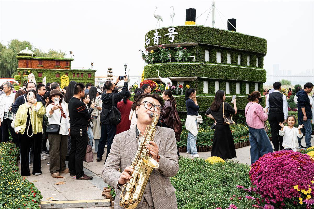 在武汉金秋菊展汉口江滩主展区,一名演员在知音号的菊花造型前演奏萨克斯。(湖北日报全媒记者 任勇 摄)