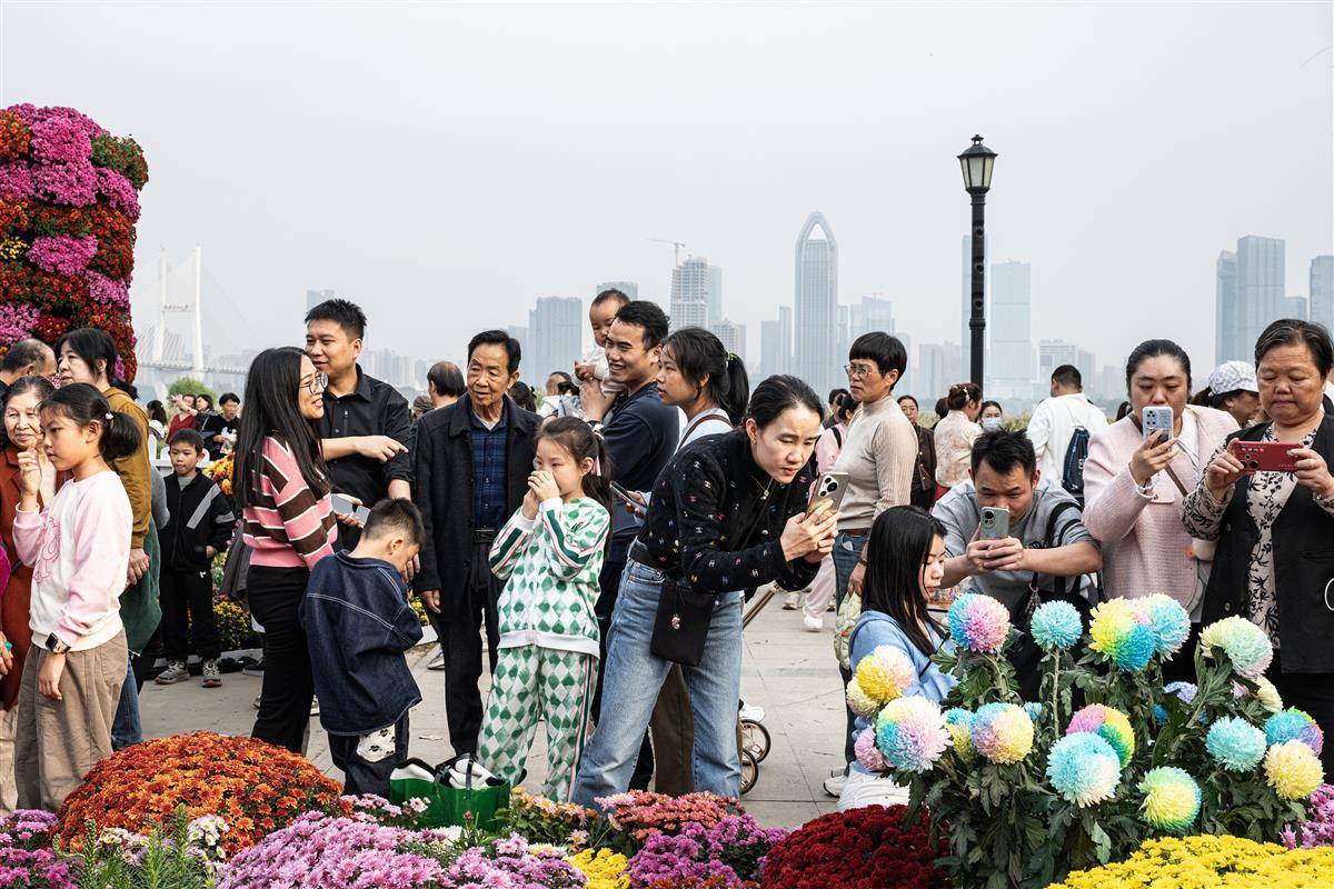 在武汉金秋菊展汉口江滩主展区,市民和游客络绎不绝亿正策略,纷纷拿出手机拍照。(湖北日报全媒记者 任勇 摄)