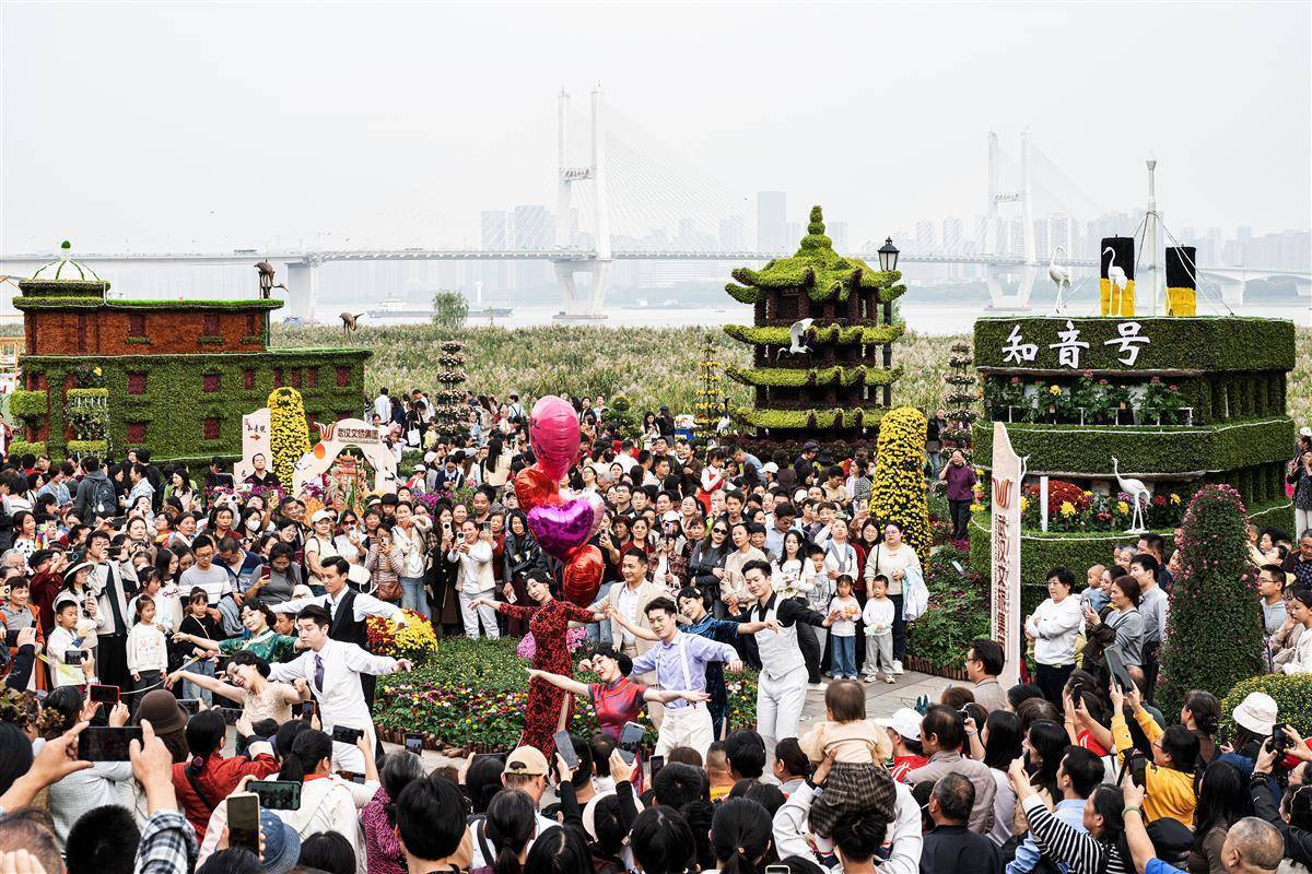 在武汉金秋菊展汉口江滩主展区亿正策略,知音号演员们带来的舞蹈快闪引得市民和游客驻足围观。(湖北日报全媒记者 任勇 摄)