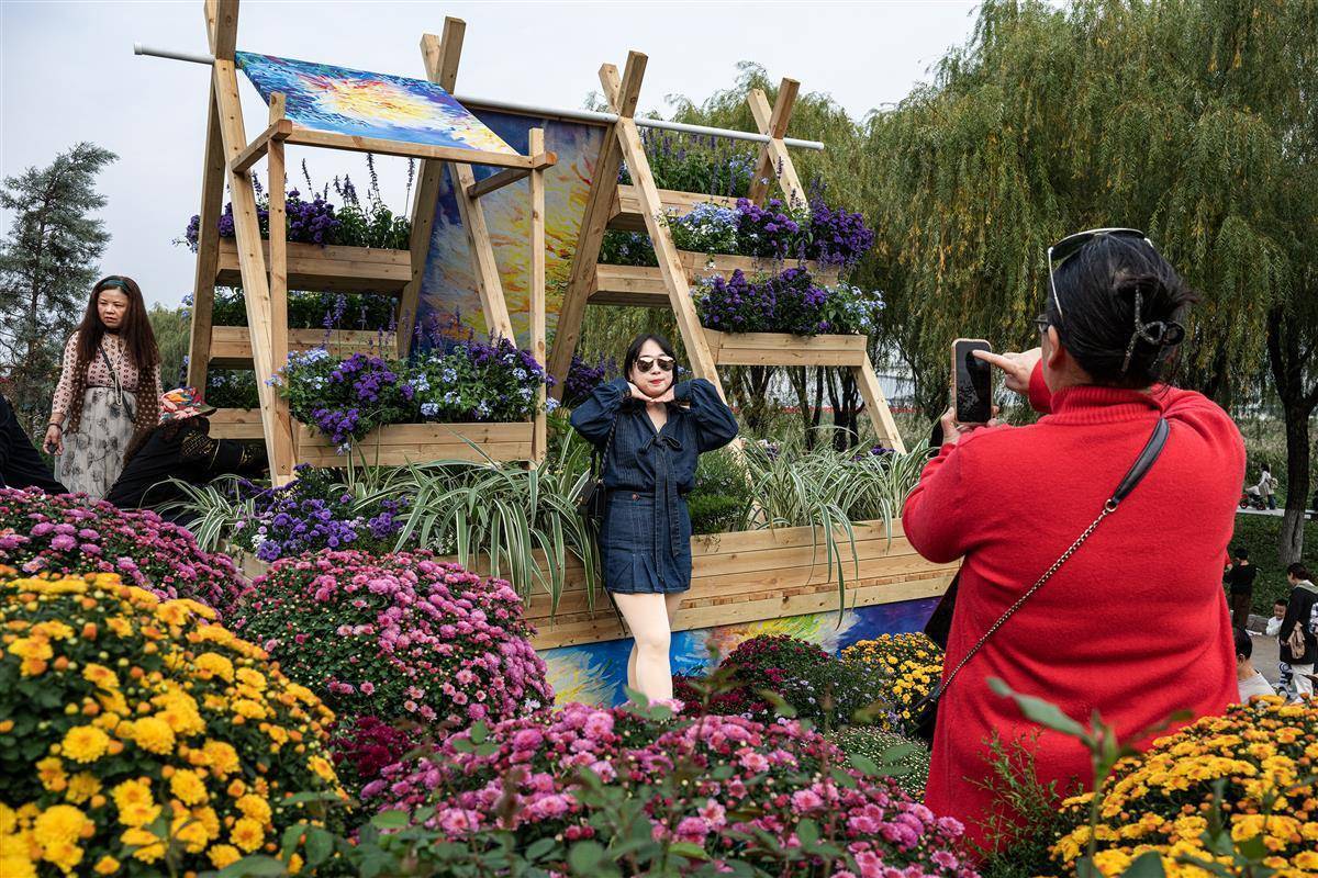 市民在武汉金秋菊展汉口江滩主展区拍照打卡。(湖北日报全媒记者 任勇 摄)