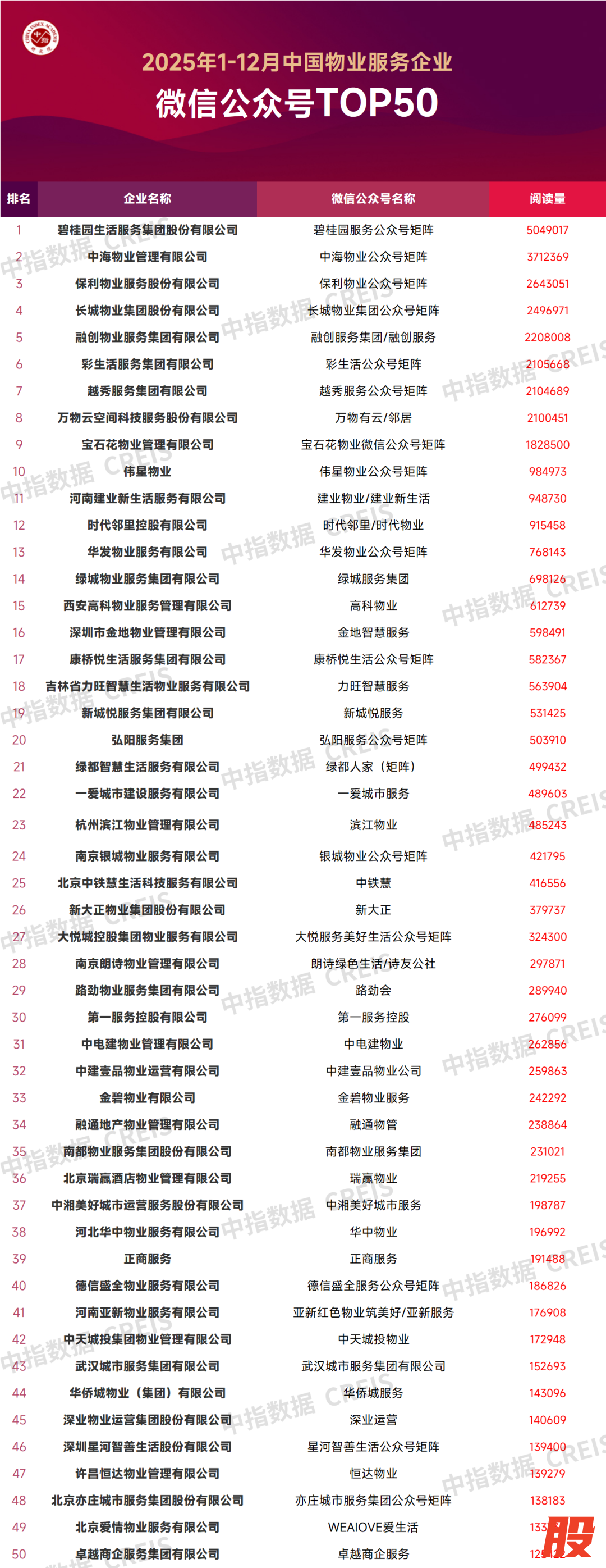 数据说明:以2025年1-12月为统计范畴,对中国优秀物业服务企业的微信公众号阅读量合计进行统计。本榜单仅供参考,课题组不对使用报告及其内容所引发的任何直接或间接损失承担责任。
