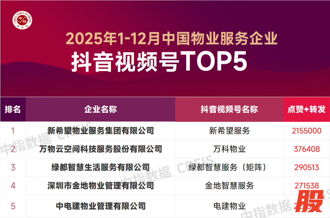 2025年1-12月,5家物业服务企业抖音视频号点赞量和转发量共计331.6万次,新希望服务尤其突出,抖音视频号点赞量和转发量超215万次。