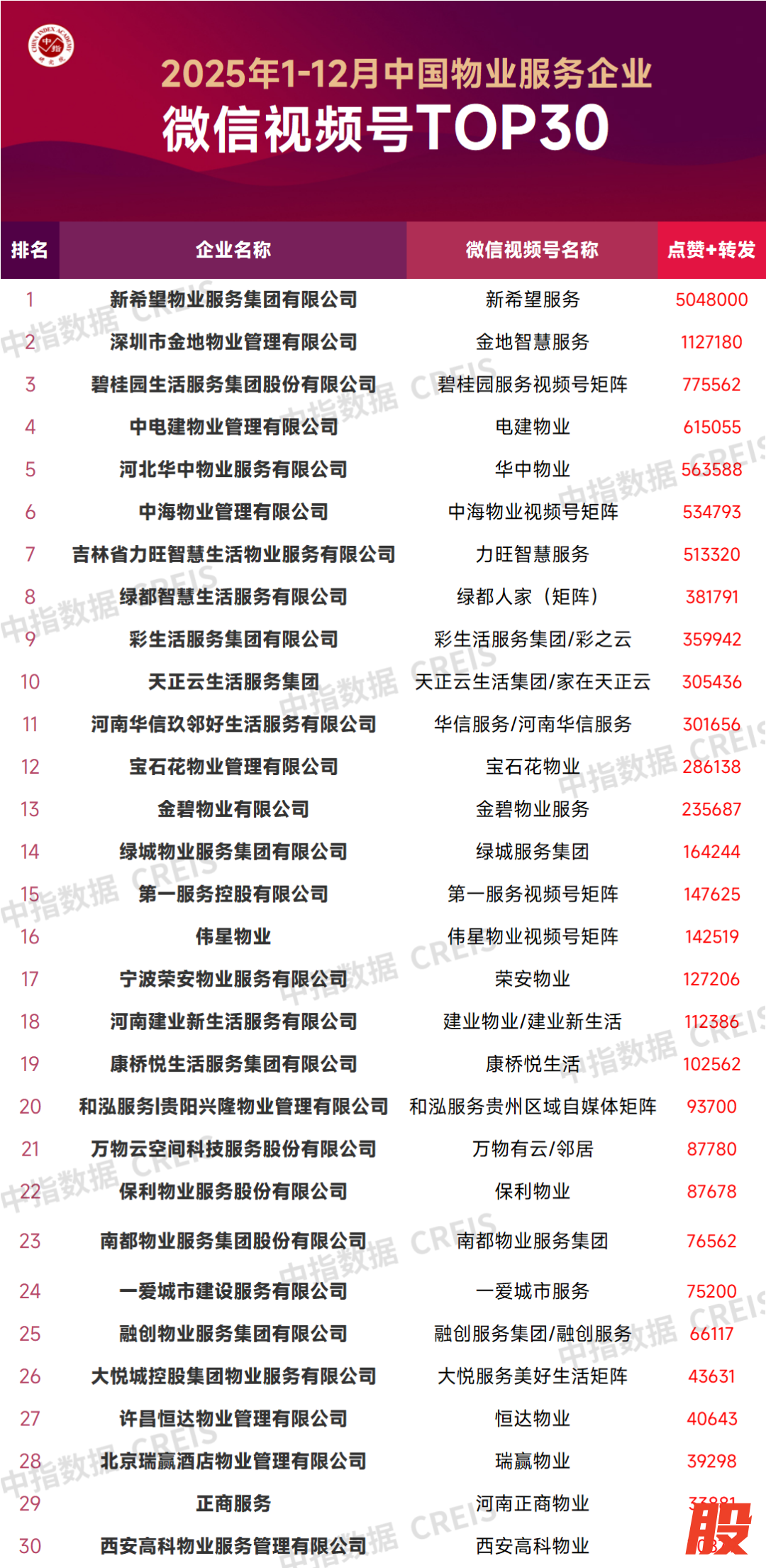 数据说明:以2025年1-12月为统计范畴,对中国优秀物业服务企业的微信视频号点赞量和转发量进行统计。本榜单仅供参考,课题组不对使用报告及其内容所引发的任何直接或间接损失承担责任。